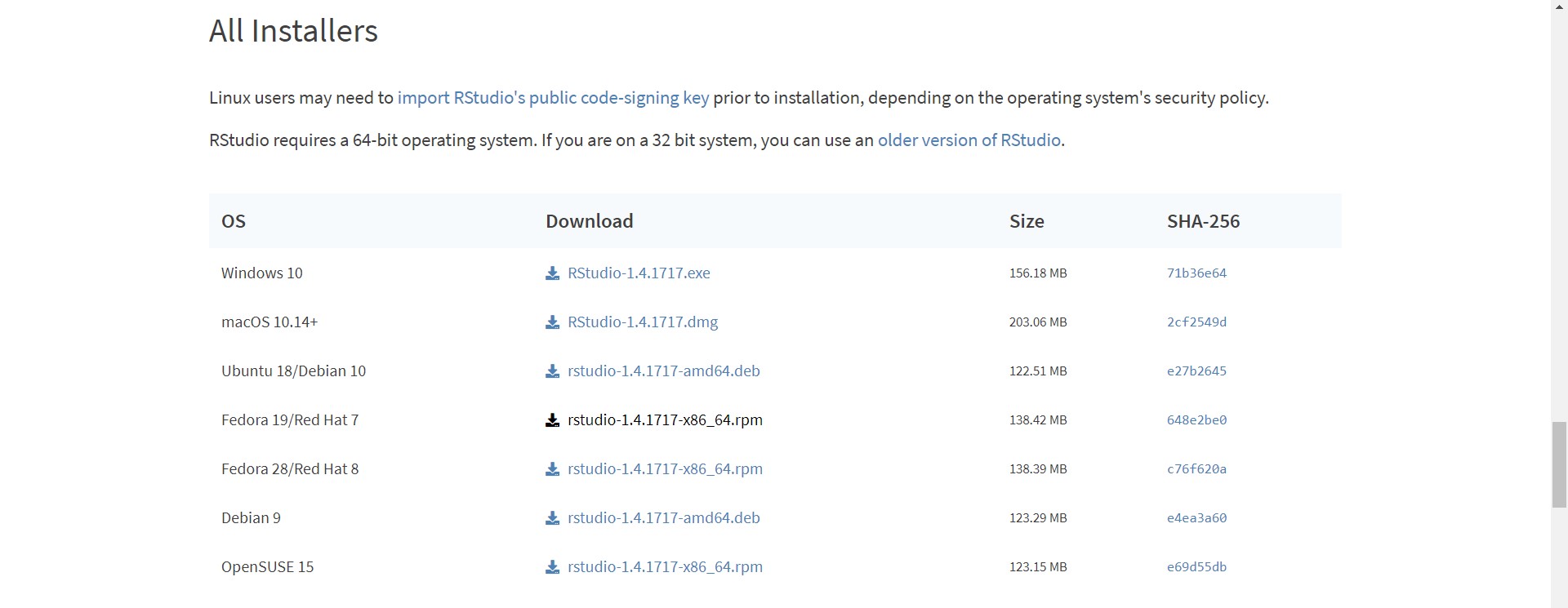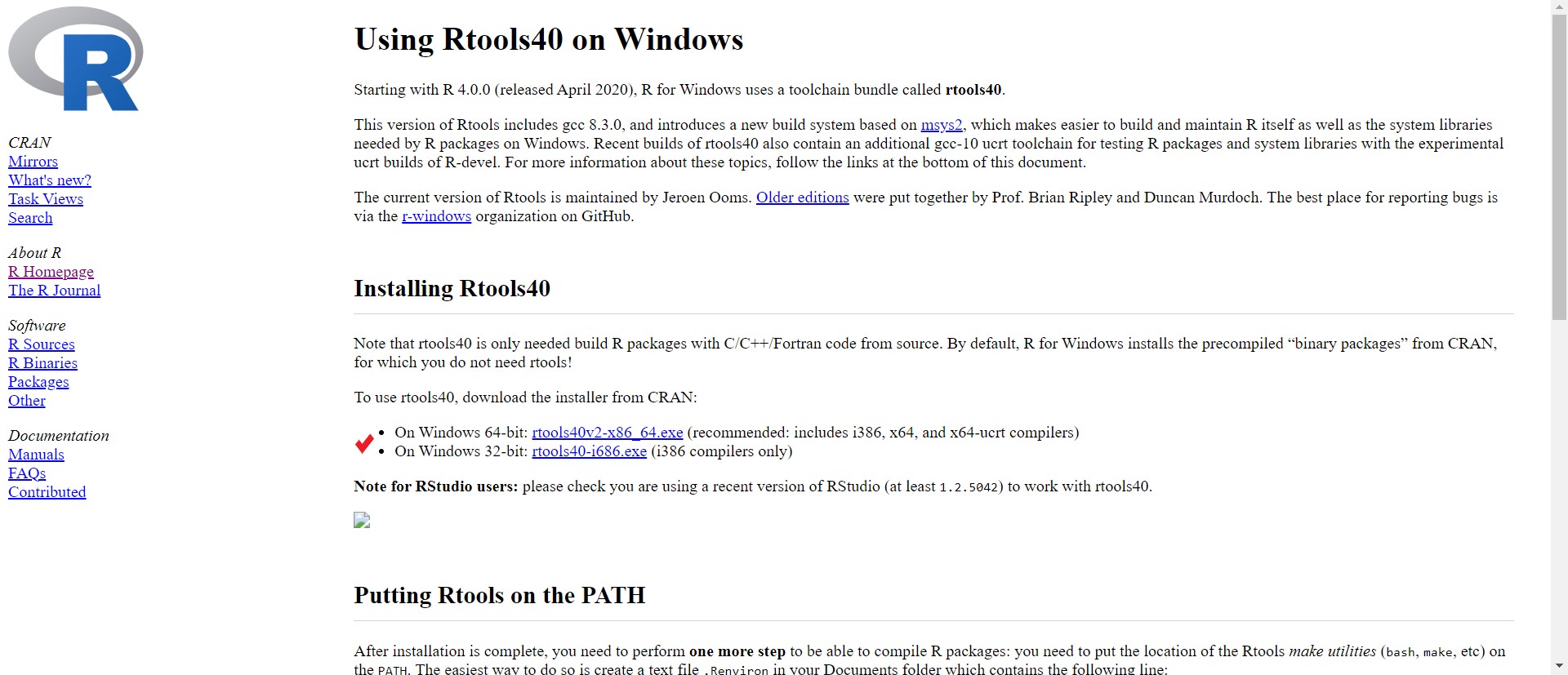 [그림 6] [그림 5]에 보면 Rtools에도 체크 되어 있다. 예전에는 Rtools가 패키지로 제공되었기 때문에 install.package("Rtools")를 입력한 후 실행 시키면 설치가 되었지만 지금은 패키지로 제공되지 않아 별도로 설치해야 한다. Rtools를 클릭하면 다음의 화면으로 이동하게 되는데 컴퓨터 사양에 맞게 64비트 혹은 32비트를 클릭하면 된다.
