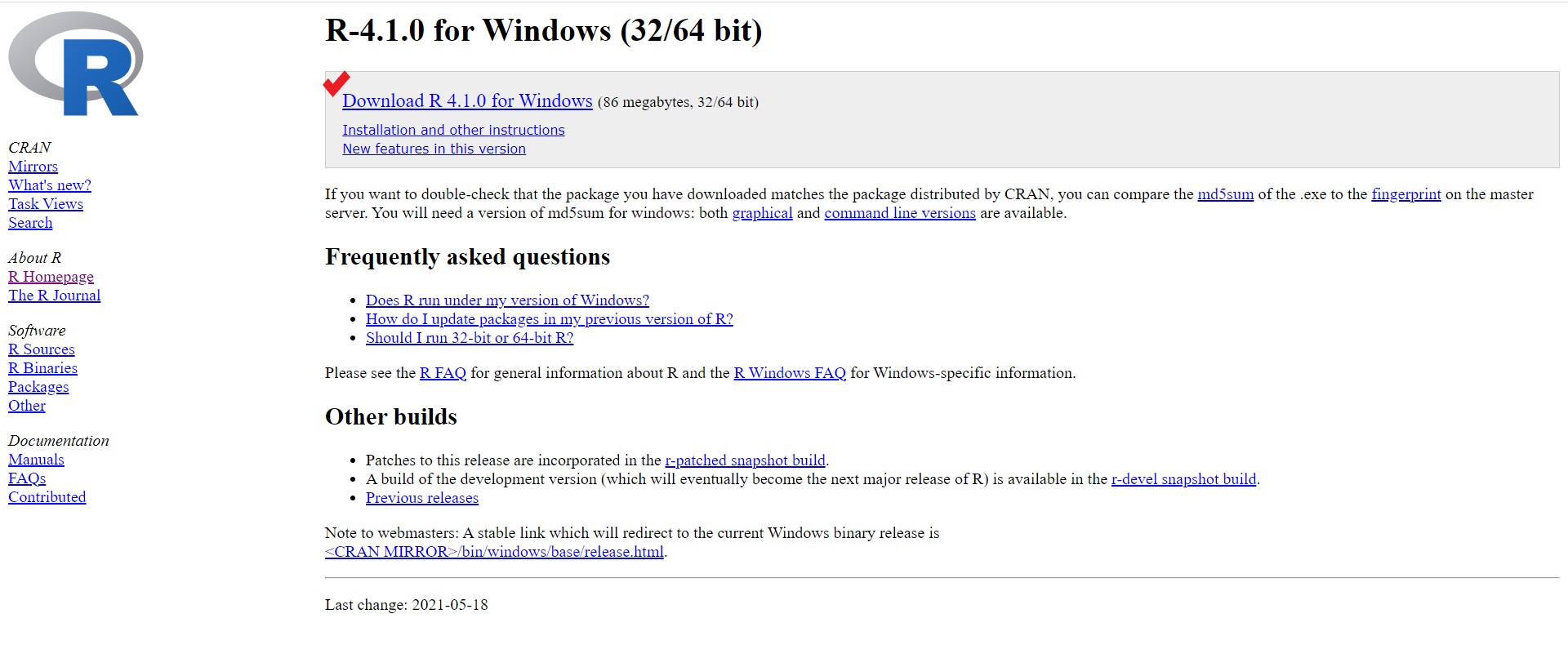 [그림 5] Download R 4.1.0 for Windows를 클릭하면 R파일이 다운로드된다.