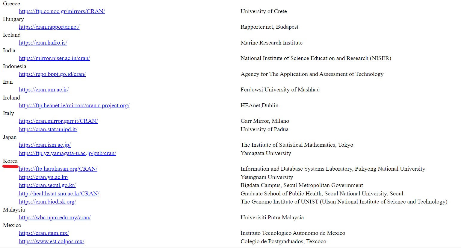 [그림 2] 왼쪽부분에 다운받을 수 있는 cloud가 나라별로 나열되어 있다. 어느 것을 선택해도 상관은 없지만 Korea에 속해 있는 링크 중에 하나를 클릭하면 된다.