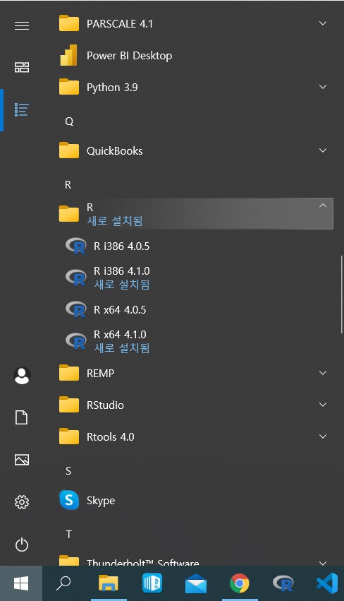 [그림 15] 왼쪽 하단에 윈도우 표시를 클릭한 후 R을 찾아보면 프로그램이 설치 되어 있는 것을 확인 할 수 있다.