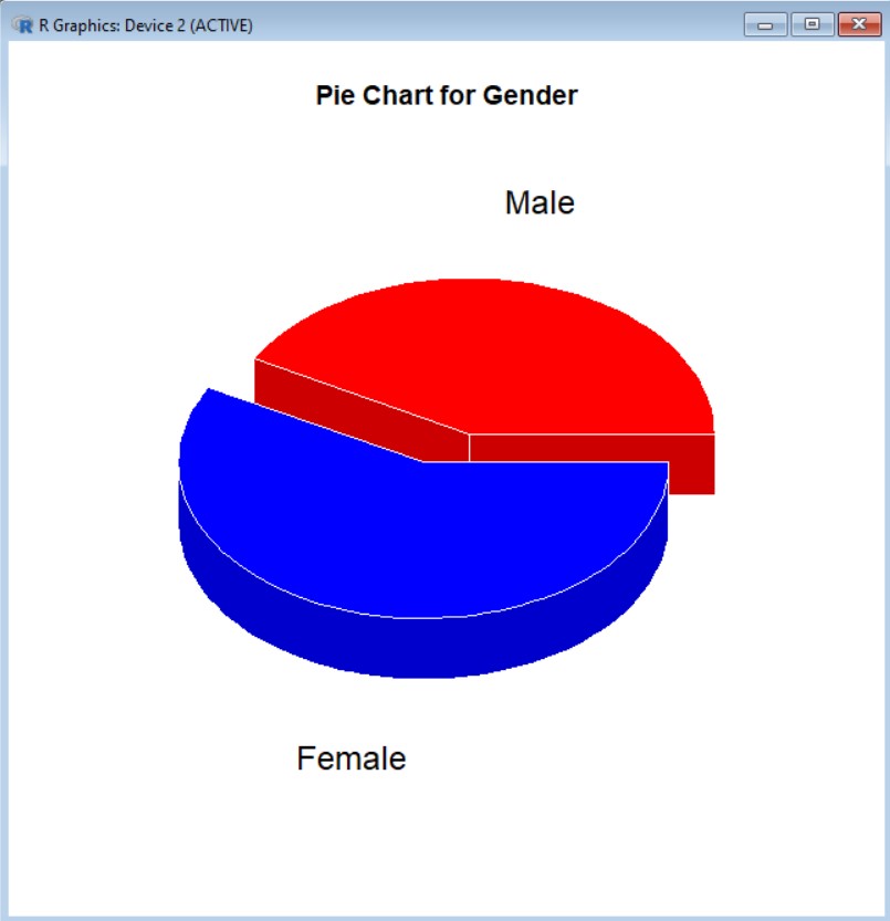 ie3D(table(em$Gender), labels=c("Male", "Female"), explode = 0.3, radius = 0.8, height = 0.1, theta=1.0, border = "white", col=c("red", "blue"), main="Pie Chart for Gender")