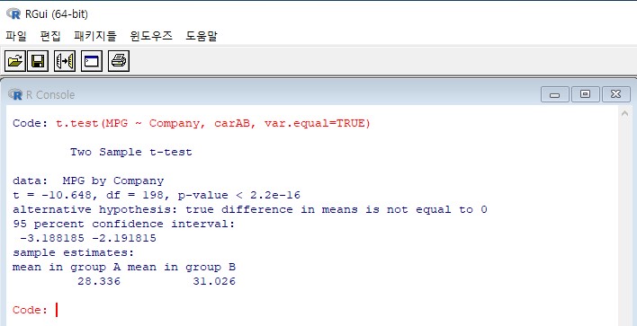 t.test(MPG ~ Company, carAB) t.test(MPG ~ Company, carAB, var.equal=FALSE)그 결과는 [그림2]와 같다.