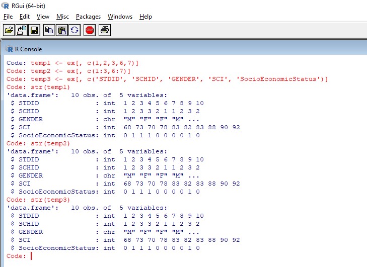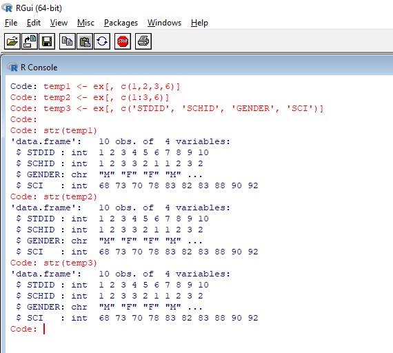 temp1 <- ex[, c(1,2,3,6,7)] temp2 <- ex[, c(1:3,6:7)] temp3 <- ex[, c('STDID', 'SCHID', 'GENDER', 'SCI', 'SocioEconomicStatus')]그 결과는 다음의 그림과 같다.
