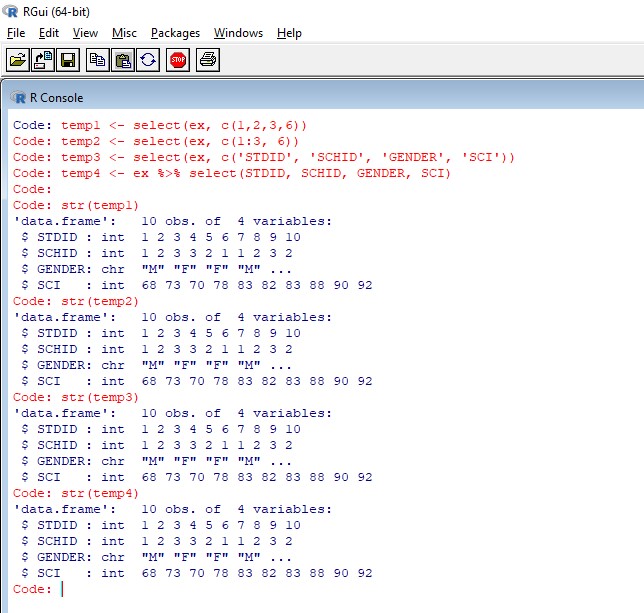 install.packages("dplyr") library(dplyr) temp1 <- select(ex, c(1,2,3,6)) temp2 <- select(ex, c(1:3, 6)) temp3 <- select(ex, c('STDID', 'SCHID', 'GENDER', 'SCI')) temp4 <- ex %>% select(STDID, SCHID, GENDER, SCI)그 결과는 [그림5]와 같다