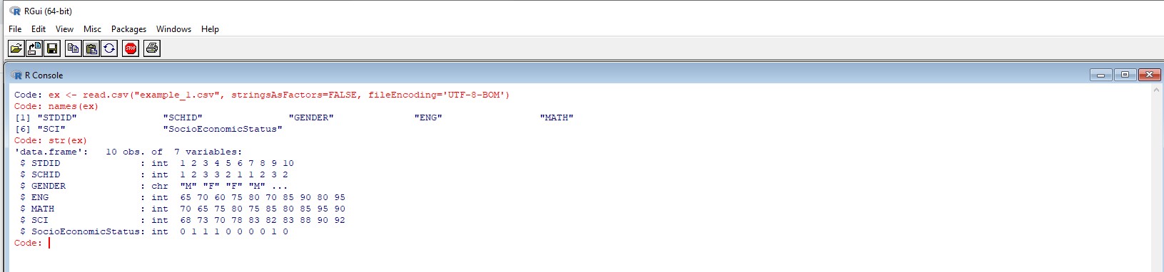 ex <- read.csv("example_1.csv", stringsAsFactors=FALSE, fileEncoding='UTF-8-BOM') names(ex) str(ex)예제 파일을 ex라는 이름으로 불러온 후 names(ex)와 str(ex)를 실행해 보면 다음의 그림과 같은 결과를 얻을 수 있다.