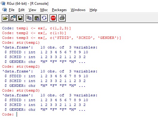 temp1 <- ex[, c(1,2,3)] temp2 <- ex[, c(1:3)] temp3 <- ex[, c('STDID', 'SCHID', 'GENDER')]그 결과 동일한 변수가 선택 된 것을 확인 할 수 있고 아래 [그림2]와 같다.