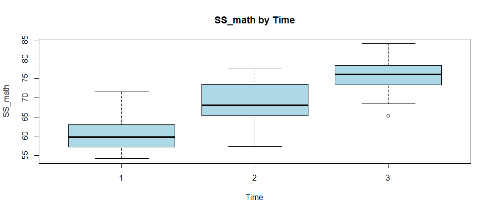 boxplot(SS_math ~ Time, data=ach, col="lightblue") title("SS_math by Time")
