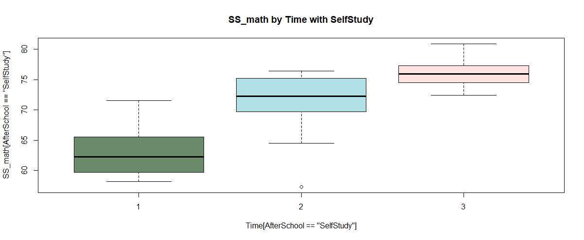 boxplot(SS_math ~ Time, data=ach, subset = AfterSchool == "SelfStudy", col=c('darkseagreen4', 'powderblue', 'mistyrose')) title("SS_math by Time with SelfStudy") boxplot(SS_math[AfterSchool =="SelfStudy"] ~ Time[AfterSchool == "SelfStudy"], data=ach,col=c('darkseagreen4', 'powderblue', 'mistyrose')) title("SS_math by Time with SelfStudy")