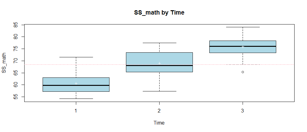 boxplot(SS_math ~ Time, data=ach, col="lightblue") title("SS_math by Time") abline(h=68.50, col="gray", lty=6) meanval <- c(60.575, 68.985, 75.915) points(meanval, col="White", pch=3, cex=0.7) text(1, 61.5, "M=60.575", cex=.5, col="red") text(2, 69.9, "M=68.985", cex=.5, col="red") text(3, 76.9, "M=75.915", cex=.5, col="red") text(1, 75, "Mean of SS_Math by Time=1 : 60.575", cex=.7, col="darkgray") text(2, 80, "Mean of SS_Math by Time=2 : 68.985", cex=.7, col="darkgray") text(3, 63, "Mean of SS_Math by Time=3 : 75.915", cex=.7, col="darkgray")