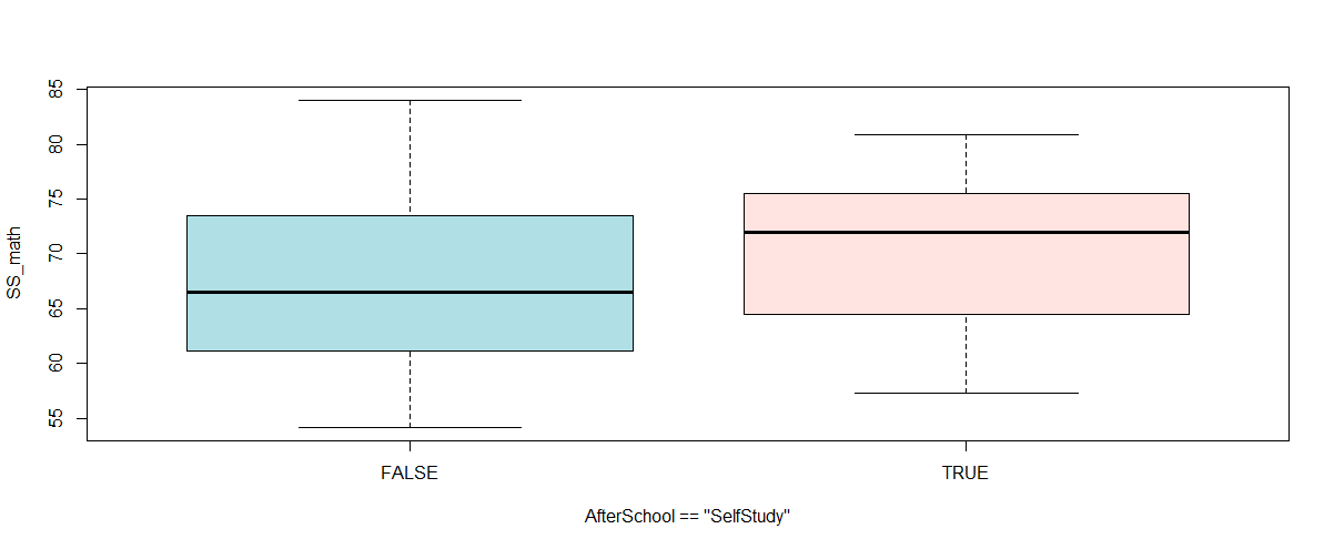 boxplot(SS_math ~ AfterSchool == "SelfStudy", data=ach) boxplot(SS_math ~ AfterSchool == "SelfStudy", data=ach, col=c('powderblue', 'mistyrose')col 지정이 없으면 아래의 [그림 13]과 같이 회색의 상자그래프가 그려진다.