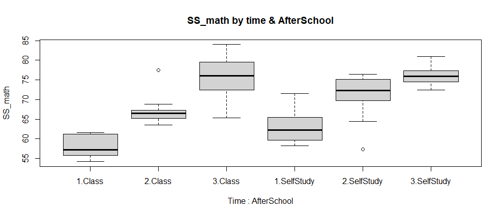 boxplot(종속변수 y축 ~ 독립변수(집단1) + 독립변수(집단2), data=데이터명) boxplot(SS_math ~ Time + AfterSchool, data=ach) title("SS_math by time & AfterSchool")