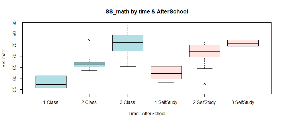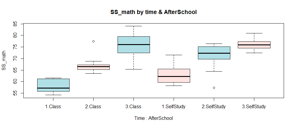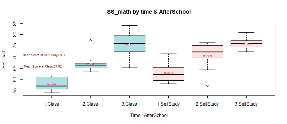 boxplot(SS_math ~ Time + AfterSchool, data=ach, col=c(rep('powderblue', 3), rep('mistyrose',3))) title("SS_math by time & AfterSchool") abline(h=67.02, col="navy", lty=6) text(0.77, 66, "Mean Score at Class:67.02", cex=.7, col="darkred") abline(h=69.9633, col="darkseagreen4", lty=6) text(0.82, 71, "Mean Score at SelfStudy:69.96", cex=.7, col="darkred")
